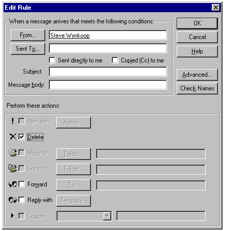 Client/server messaging introduces a very important feature to mail systems-the capability to have the server preprocess messages on behalf of the recipient. The Inbox Assistant of the Exchange client lets you establish rules that govern the processing of your incoming messages. Figure 23.2 shows how to establish a rule that causes any message from Steve Wynkoop to be deleted on receipt.