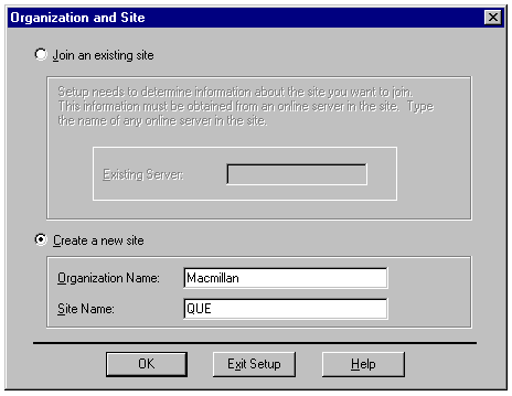 Choose organization, site, and server names carefully before you install Exchange. After you install Exchange, changing fundamental implementation details, such as the site name or organization name, requires you to reinstall Exchange Server 4.0.