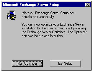 When completed, the installation process offers you the opportunity to run the Optimizer utility (see fig. 23.13). It's strongly recommended that you run this utility to optimize your hardware and software configuration for the number and types of users of Exchange. Run the Optimizer utility immediately after you set up the Exchange server. Although you can skip the optimization step during installation and run the utility later, starting with the optimum configuration assures that users will gain the maximum performance available from the messaging system.