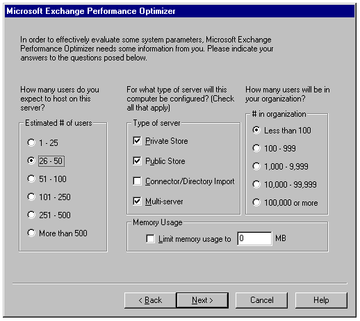 You can run the Optimizer at any time from the Microsoft Exchange Optimizer choice that's installed in the Microsoft Exchange program menu. You have the same options as when running Optimizer during installation, and you can upsize your server configuration whenever necessary. It's a good idea to run the Optimizer whenever you have a significant change in the configuration of your server. Such changes include adding a large number of users to the system, adding memory, and adding services to or removing services from the server.