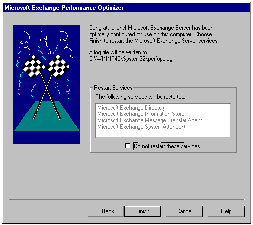The final dialog of the Exchange Optimizer, offering the option to restart Exchange services.