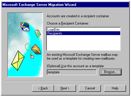 Specifying the recipient container for Exchange accounts and a template file for creating Windows NT accounts.