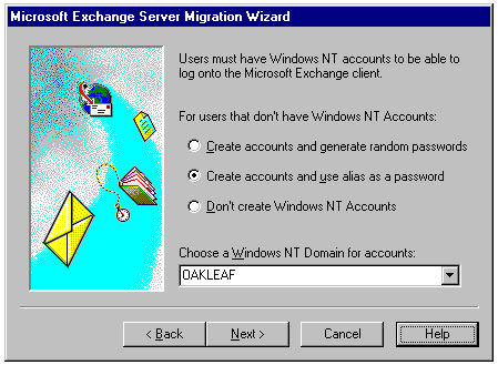 Selecting the type of password to create for new Windows NT accounts and specifying the domain for the accounts.