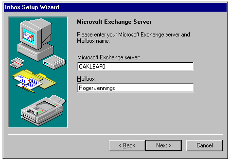 Entering the name of the Exchange server and the user's mailbox name.