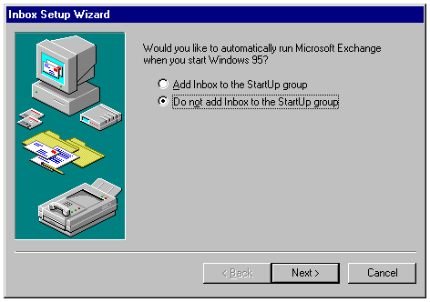Choosing whether to add the inbox to Windows 95's StartUp program group.