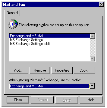 After the Exchange software is installed on the client system, you can establish multiple client profiles that each specify the set of information providers. To view client profiles, double-click Windows 95's Control Panel's Mail and Fax tool or Windows NT's Mail tool; then click Show Profiles in the Services page of the Microsoft Exchange Properties sheet to open the Mail and Fax property sheet. When you install the client software, the existing Exchange profile, if any, is saved and a new profile is created (see fig. 23.35). After you verify that the current MS Exchange Settings profile works, you can delete the MS Exchange Settings (old) profile.
