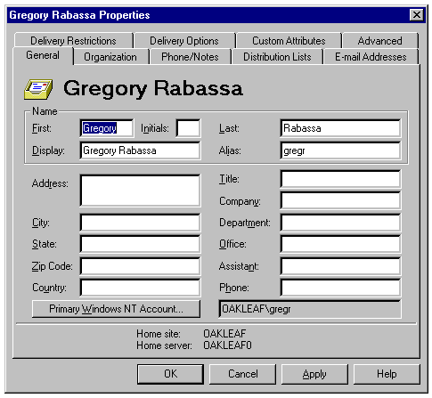 | General | This page sets up the base account. You specify the alias, descriptive display name, and address information for the mailbox. This page also specifies the Windows NT user account that's associated with the mailbox. |