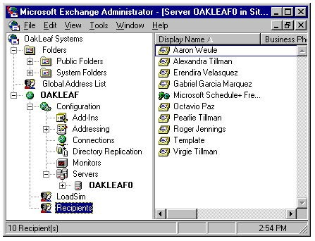 The Recipients container stores all mailbox accounts. Selecting the Recipients container, the default for new users, in the left pane displays all the container accounts in the right pane (refer to fig. 23.49). Double-clicking an individual recipient item displays the Username Properties sheet, as shown earlier in figure 23.48.