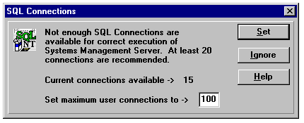 The message box that appears if you have fewer than 20 connections specified for the SQL Server installation used with SMS.
