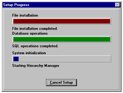 The Setup Progress dialog's display near the end of the SMS installation process.