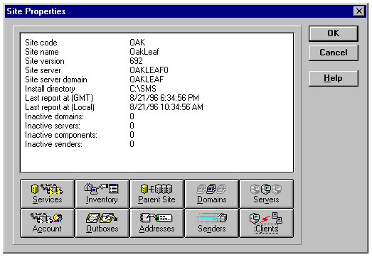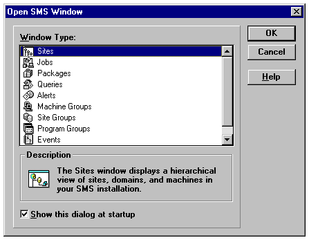 The SMS Admin application, modeled on Windows Explorer, is deceptively simple. SMS Admin has 10 window styles that you use to perform administrative duties or monitor SMS operations. Table 24.1 lists the window name and the description (from the Open SMS Window dialog) of the window's function.