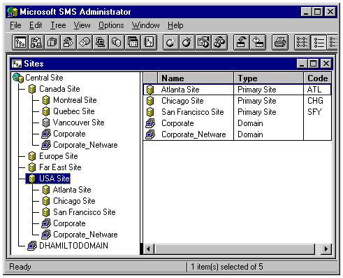 The Sites window displays all the SMS sites in a hierarchical list. The right pane displays the next level of the hierarchy selected in the list. Figure 24.15 shows the site hierarchy from the SMSDemo database; the Canada and USA Primary Sites are expanded to show the first level of detail, their child sites, and the domains to which the sites belong.