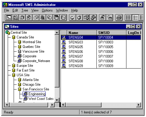 Double-clicking an entry in the Sites list expands the hierarchy for the site. For example, figure 24.16 shows in the right pane the client PCs of the Engineering group of the San Francisco site. The right pane displays the NetBIOS Name of the computer, SMSID (an SMS internal code), LogOn Name, SystemType (client platform), and SystemRole (Workstation or Server).