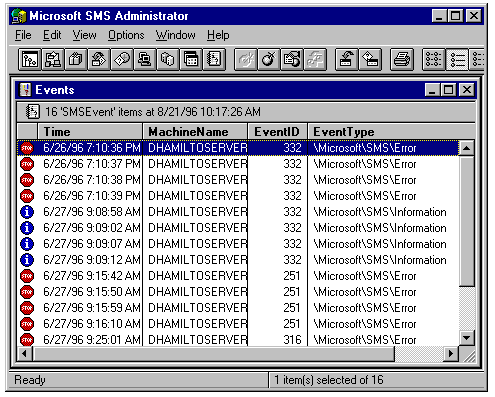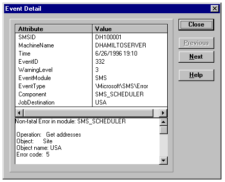 This tool lets you monitor Windows NT events generated by SMS. Figure 24.27 shows the Events window with events triggered by operations using the SMSDemo database. You double-click the event item to display the Event Detail dialog (see fig. 24.28).