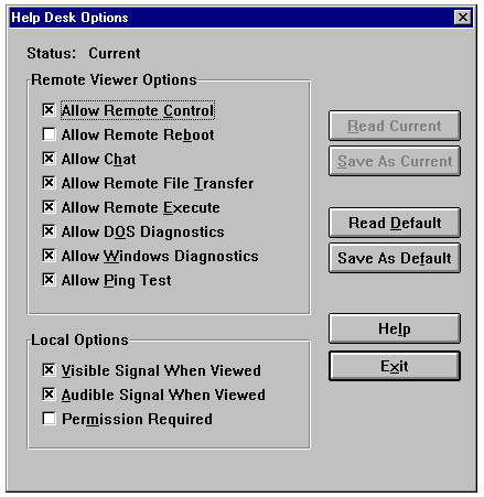 To perform Remote Control or Help Desk functions on a targeted machine, the Remote Control Agent must be running on the client. The command line for the Remote Control Agent is placed in the client's AUTOEXEC.BAT file during initial installation of the client software. For you or Help Desk personnel to support a machine, access rights must be granted to them by the machine's user. For security reasons, some machines might be made inaccessible to support personnel.